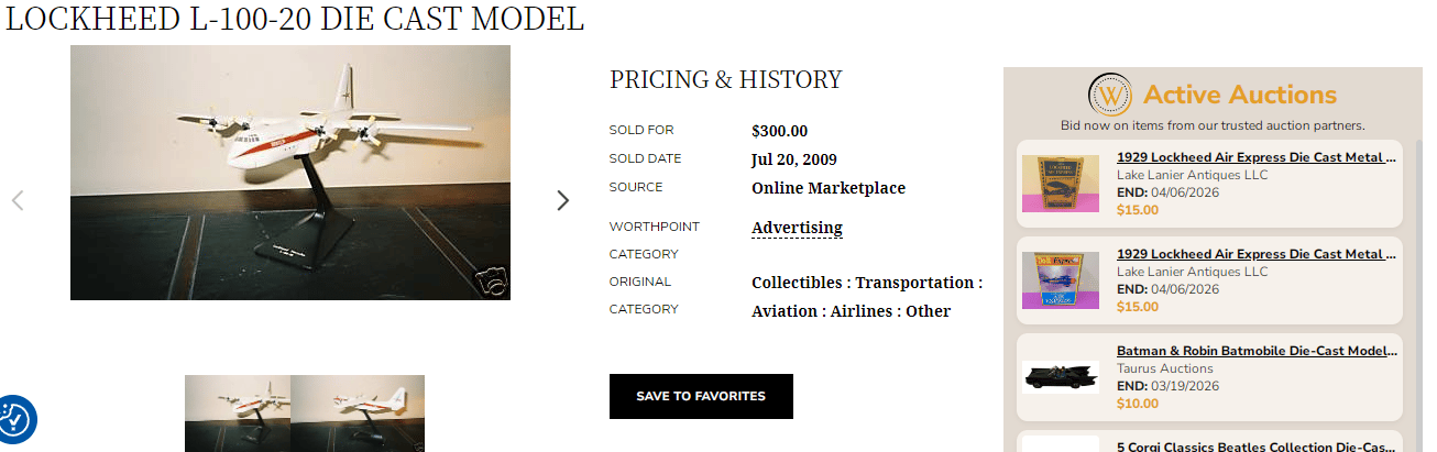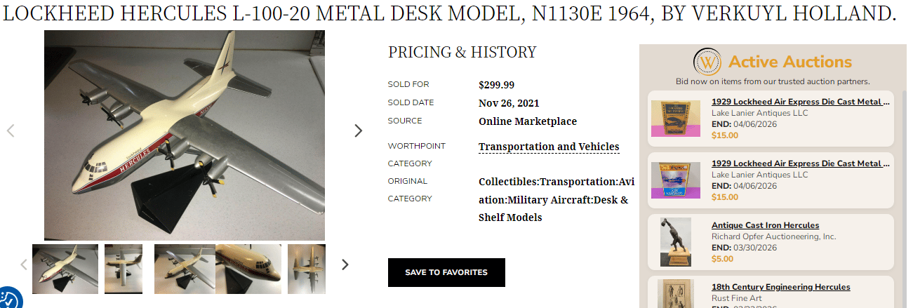 Screw it, I’m going back in. I look over all the models and decide to buy the one that I think looks the most expensive. Again, there are no Active or Sold listings for any of these. I take a gamble on the Lockheed Hercules L-100-20 for $18 that comes with a nice tobacco stain colorway.