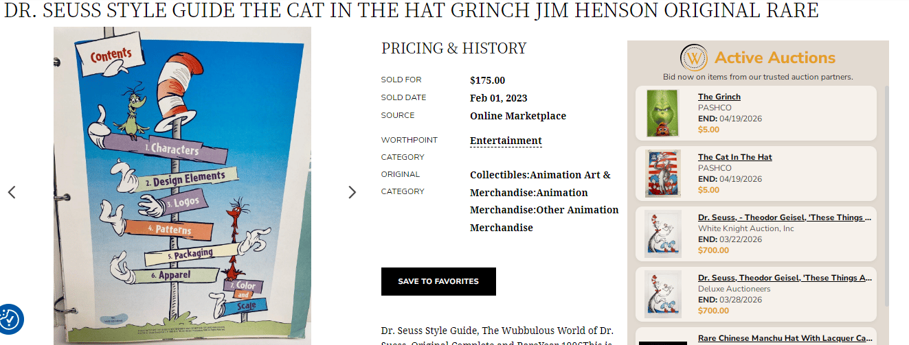 These Style Guidelines from 2005 were made exclusively for licensees of the brand. These were never made for public sale. It’s a behind the scenes look at the Dr. Seuss brand. There’s no Active Listings, no Sold Listings. We have to go onto Worthpoint all the way back to 2023 to see anything similar (remind me to cancel the 7 day trial).