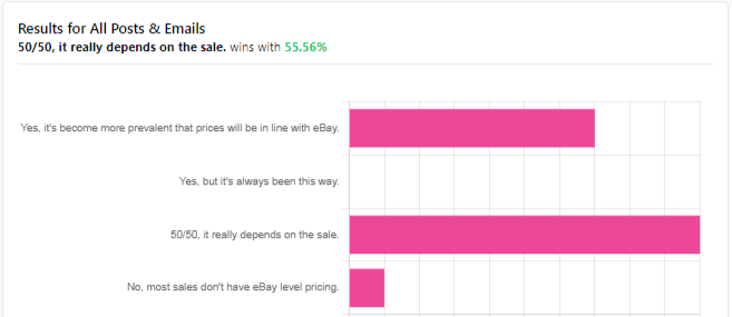 Last week I asked you: “Have you noticed garage sale prices being more in tune with eBay prices lately?“ and here are the results: