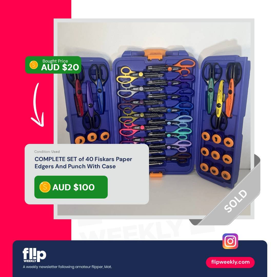 I wouldn’t have picked these up if they weren’t branded. This is a huge carry case full of Fiskars scissors and punches for scrapbooking. You can get this sort of stuff from Kmart or even Temu but it’s the branding that drew my eye 7 months ago when I bought this set. It’s taken a while to sell but we still profited $80.