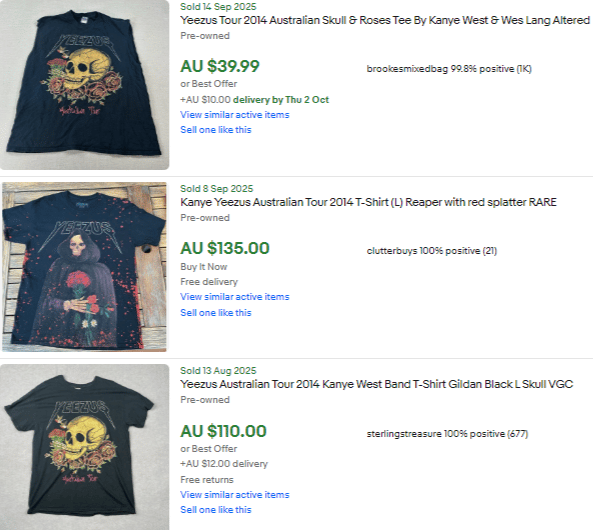 Kanye West toured Australia back in 2014 with his Yeezus tour and this piece of merch has made it to an op shop and priced up at just $12. Fed up with Kanye’s antics or updating their wardrobe? Doesn’t really matter, we can mark a lot of money with this find. We don’t have exact eBay Sold Comps but we do have some that are pretty close.
