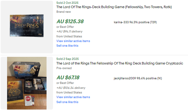 Australia has a severe lack of The Lord of the Rings: The Fellowship of the Ring Deck-Building Games… meaning we have 0 available on eBay. You’d have to luck out locally to find this. With this information in hand, and knowing that both Lord of the Rings and these board games are insanely popular, we can aim high.