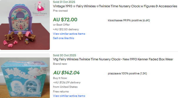 At the time, it came with 4 little accessories but was incomplete. I put it on eBay for $59.95 and it received a decent amount of views and a watchers. So then I walk into Vinnies and see the complete in box version for just $4 and I immediately know to buy it. This brand, Fairy Winkles, was made by Kenner in the early 90’s and each playset came with tiny fairies that could hide and play in them.