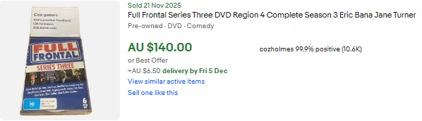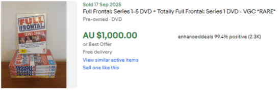 If you can find all 5 seasons of Full Frontal on DVD at your local op shop you can expect to get paid big money for it. It’s out of print, hard to find and highly sought after.