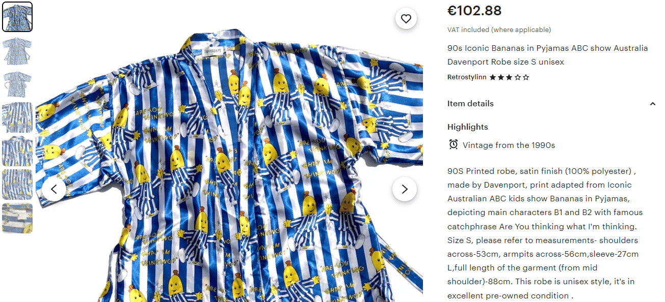 For me personally, Etsy as a standalone source isn’t very comforting however there’s nothing on eBay. No Active, no Sold. The absolute closest I could get was an XS nightie that was $50 + postage with multiple watchers using a similar pattern. Apart from that, nothing. The question remains… is this a $180 robe? Surely not…