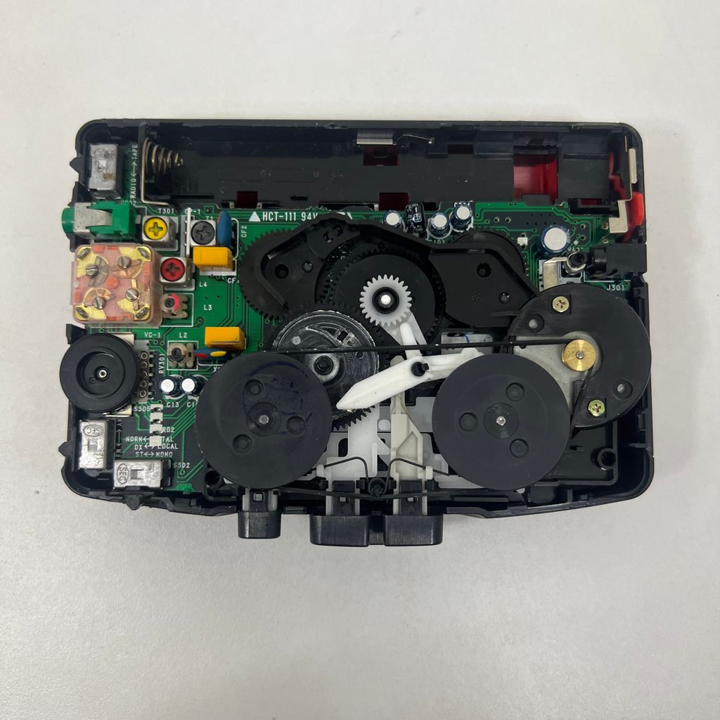The Sony Walkman WM-FX10 doesn’t require any screws to be opened up. What you do is open up the battery compartment and gently pull the plastic apart, moving your fingers around the outside of the player so the case doesn’t snap. From there, it will pop open and you’ll see the below.