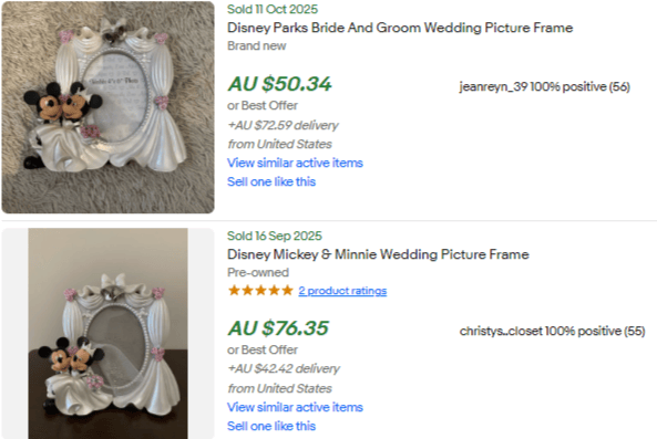 Newlyweds in the US are buying this photo frame anytime it’s listed up. What about Australians? I can’t see any Active or Sold Listings. We’re breaking new ground here. So what do we do? Firstly, we add on our Australia Tax and aim high. I'm thinking $79.95.