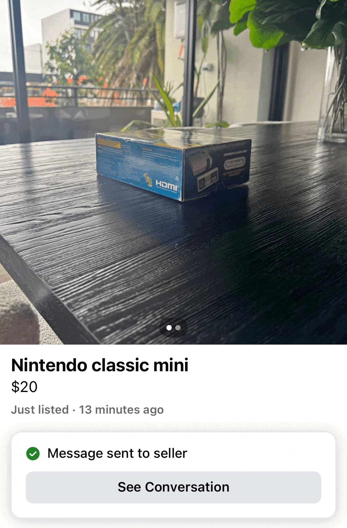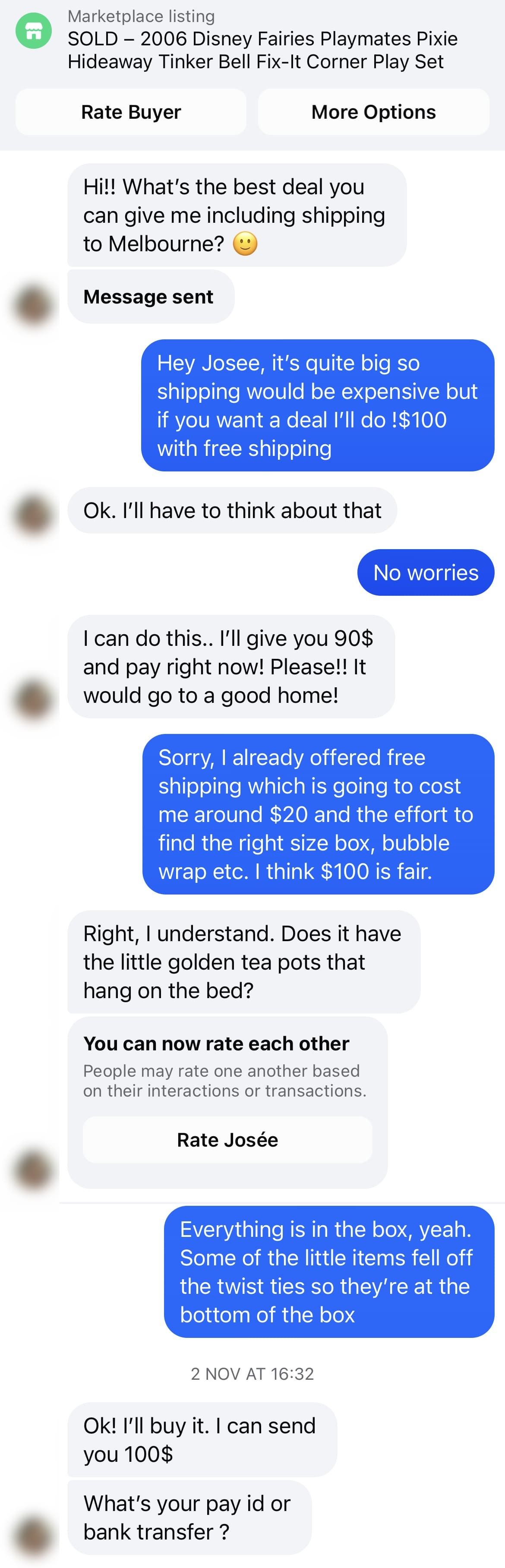 For anyone curious about the amount of questions, the intention is to get this bloke as invested in the transaction as me. The last thing I want to see is this listed up on Marketplace, so I prompt a response with cash or transfer and re-confirm the deal by asking for his phone number. I already had the number but by giving it out again it acts as a commitment. Not 100% needed, but it helps. Same with asking for an item to be marked as pending.