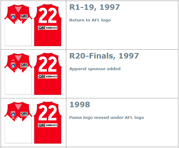 I was immediately drawn to this jersey not only because it had its original retail tags but I could tell it was pre-2000 based on the AFL logo and clothing tag. It’s real easy to date this jersey. I type “Sydney Swans jersey year by year“ into Google, click the 1st website which documents the jerseys and scroll until I find what I’m looking at. In this case: