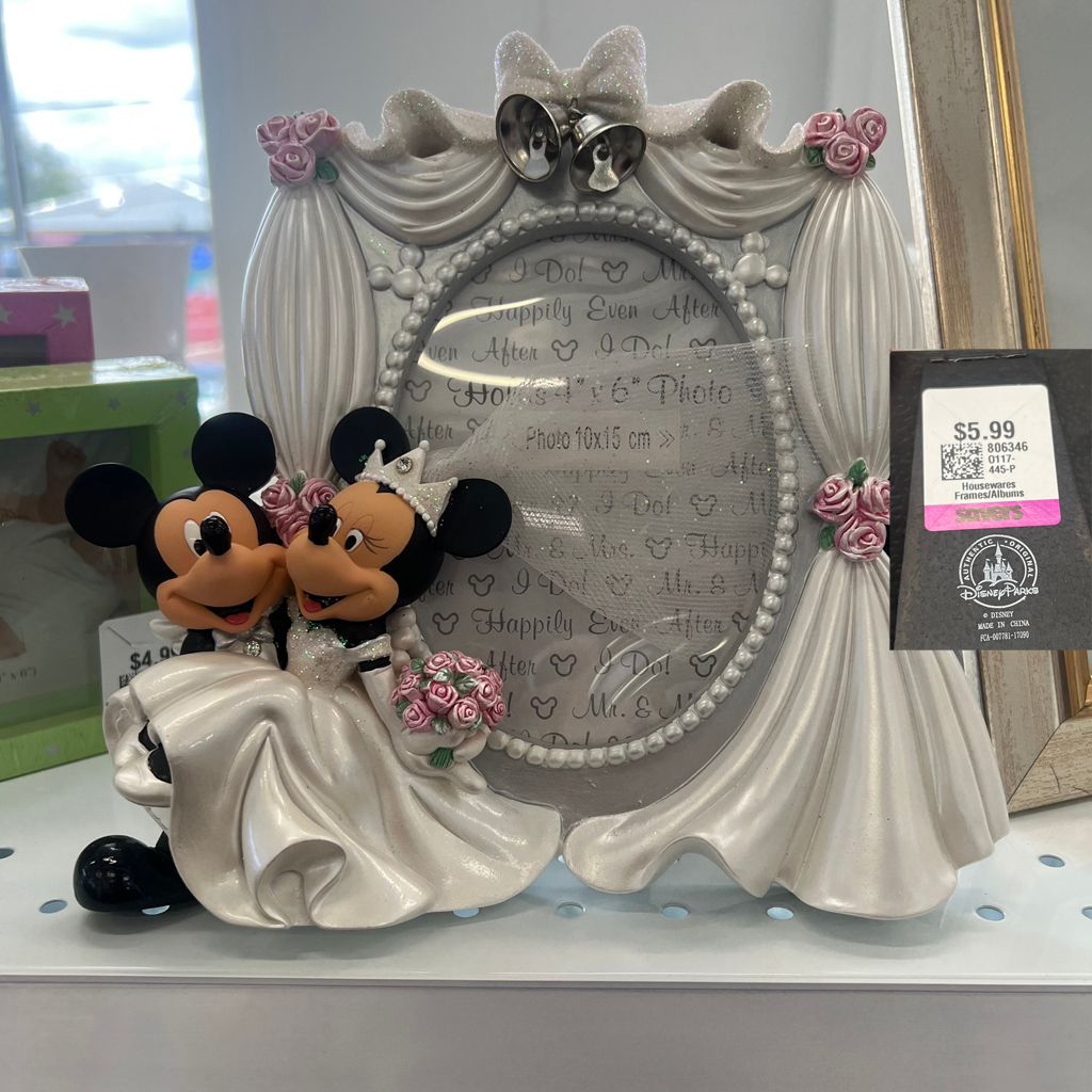 This is a Disney Mickey & Minnie Mouse wedding photo frame. The characters are 3D standing out from the frame, the veil Minnie is wearing can be adjusted across the 4” x 6” photo, the “bells“ can move and make sound and it’s generally a nice looking high quality resin frame.