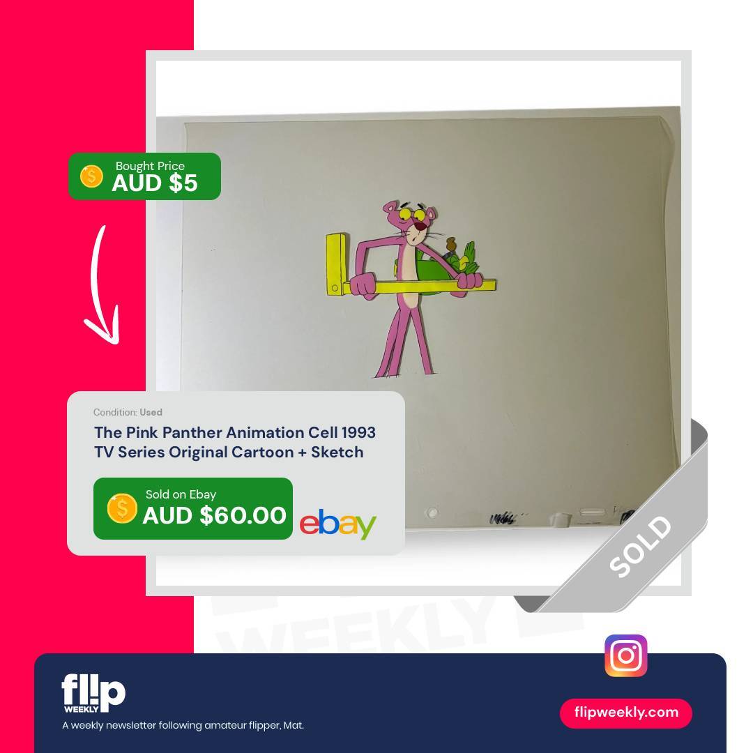 Back in very early 2024 I was hitting up Pawn Shops looking for items to flip. It was semi-successful and since then I’ve sourced and flipped several cool items. On this day in 2024 I found 3 Pink Panther animation cells and paid $70. Just looking at these cool pieces I knew they’d be worth more than $23 each. I was right, I put in a bit of time to identify the episodes they featured in (and leaned on the internet) and the 1st cell was sold very quickly for $150 and off to Italy.