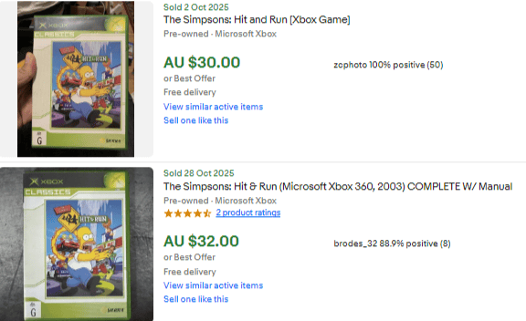 The sales above were for the later re-release which is the “Xbox Classics” whereas the one we found was the original release, called the black label. Black label version on Xbox is a $100 game. Same thing with the PS2. A lot of people, author included, get confused between The Simpsons games trying to remember which one is the one to pick up. Well, it’s Hit & Run. Not Simpsons Road Rage, not Simpsons Skateboarding, not The Simpsons Game, but Hit & Run. When you think Hit & Run, think Buy & Run. Buy that sucker and get out quick before they realize what they’ve done.