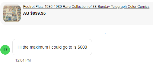Knowing you can get $1,000 for a complete collection of 27 Footrot books, I decide to aim high. $1,000 for 38 newspapers. It seems high but collectors are crazy and if we go off the auction of around $25 per newspaper, we have 38 and that equals $950 so it makes sense. As of listing, its received around 46 views, 6 watchers and a $600 offer which was turned down.