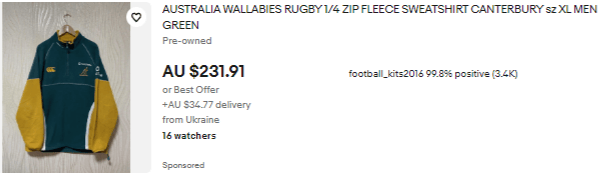 Believe it or not, this Wallabies fleece ¾ jumper is quite rare and hard to find. I could only find 1 Active Listing anywhere online and it was going for a lot of money. By the way, what’s with a lot of Australian sports gear coming out of Ukraine? I’ve noticed that over the past few months.