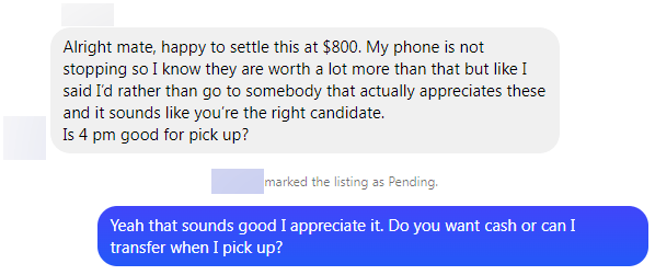 After a bit more back and forth $500 is the amount we seemingly agree on. I offer to come out there and then and pay cash but he’s out with family. Next is an amateur move from me. I should have locked the price in, mark the listing as pending to stop incoming messages. Instead… because I may have been recovering from the night before, just left it. If the deal goes through, great it’s a good deal, if it doesn’t, even better we can stay in bed.