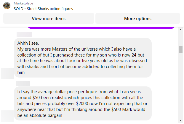 I tell him that I grew up with Street Sharks, I have home videos of me getting Slammu as a present and that I’m also a content creator who was interested in buying this collection to show off. From there we talk a bit more about our collections and prices come up again.