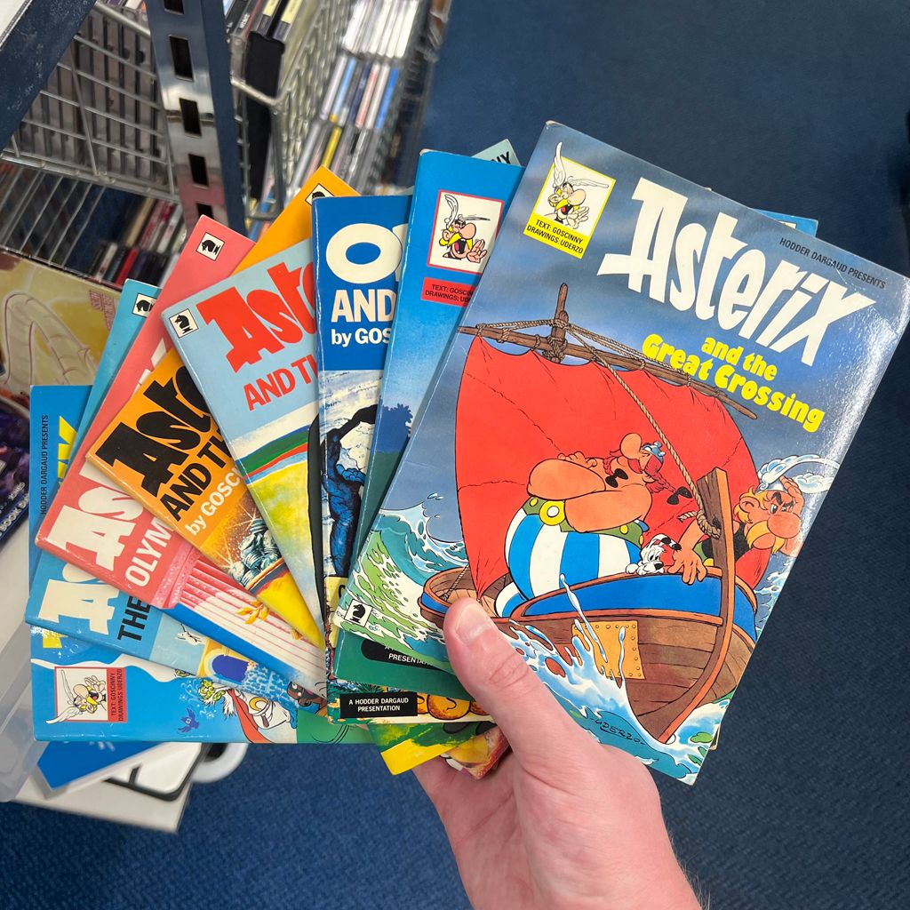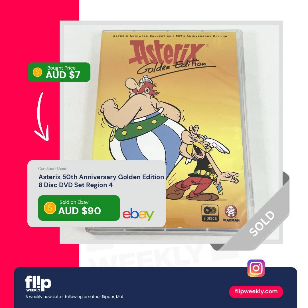 Always be buying Asterix. DVD’s, books, merchandise, it all sells to a dedicated fan base. This $6.99 DVD containing 8 Asterix movies is off to the UK after the buyer spent a total of $143.03 on the DVD, shipping and taxes. Just this week I found more Asterix, this time a collection of pocket books for $2 each.