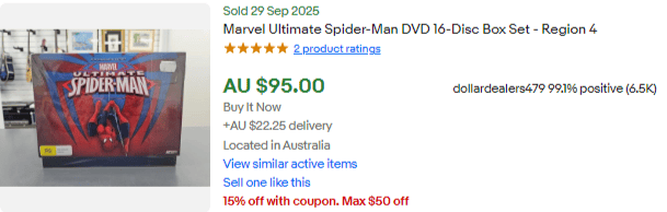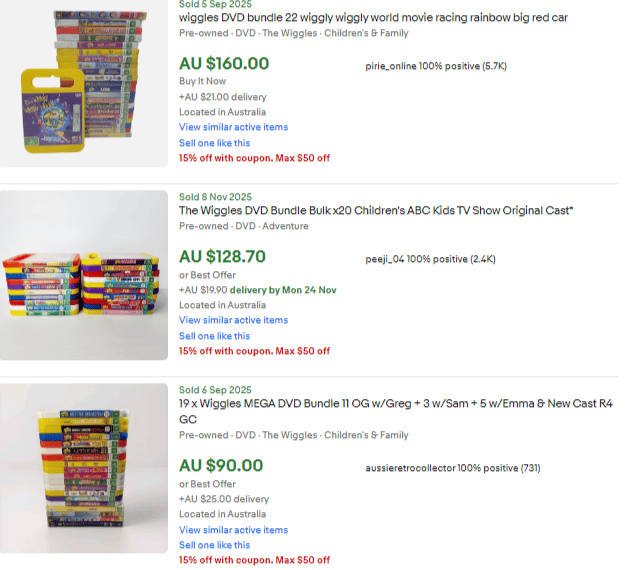 After checking out the physical appearance of the discs, all of them were in great order and I searched them up on eBay. We didn’t have a single DVD worth over $25 but comps show that we could hold out for a sale price of around $150. I’m aiming for a quick sale so they’re up for $100. From now on I’ll stick to the original cast, that’s where the value lies.