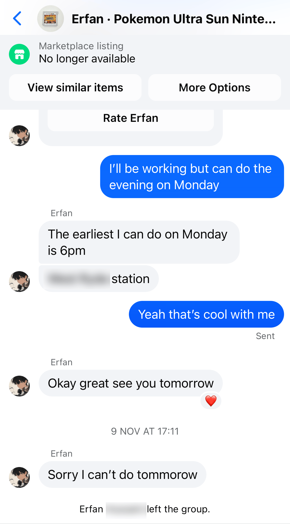 The dude wants to meet at the train station, I reluctantly agree. He sets the time and place and even barters down the price. Next minute, he’s out of the chat. Fun!