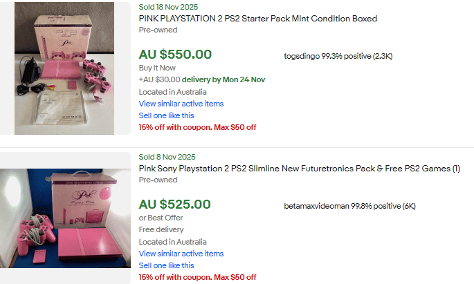 Nevertheless, I think she looked up comps for just a PlayStation 2 and didn’t take into account that when you have variations of an item, whether it’s a different colours, different graphics and when you have the original box, it can add a significant amount of money onto your item. Check out the Sold Listings for a boxed pink PS2 below.
