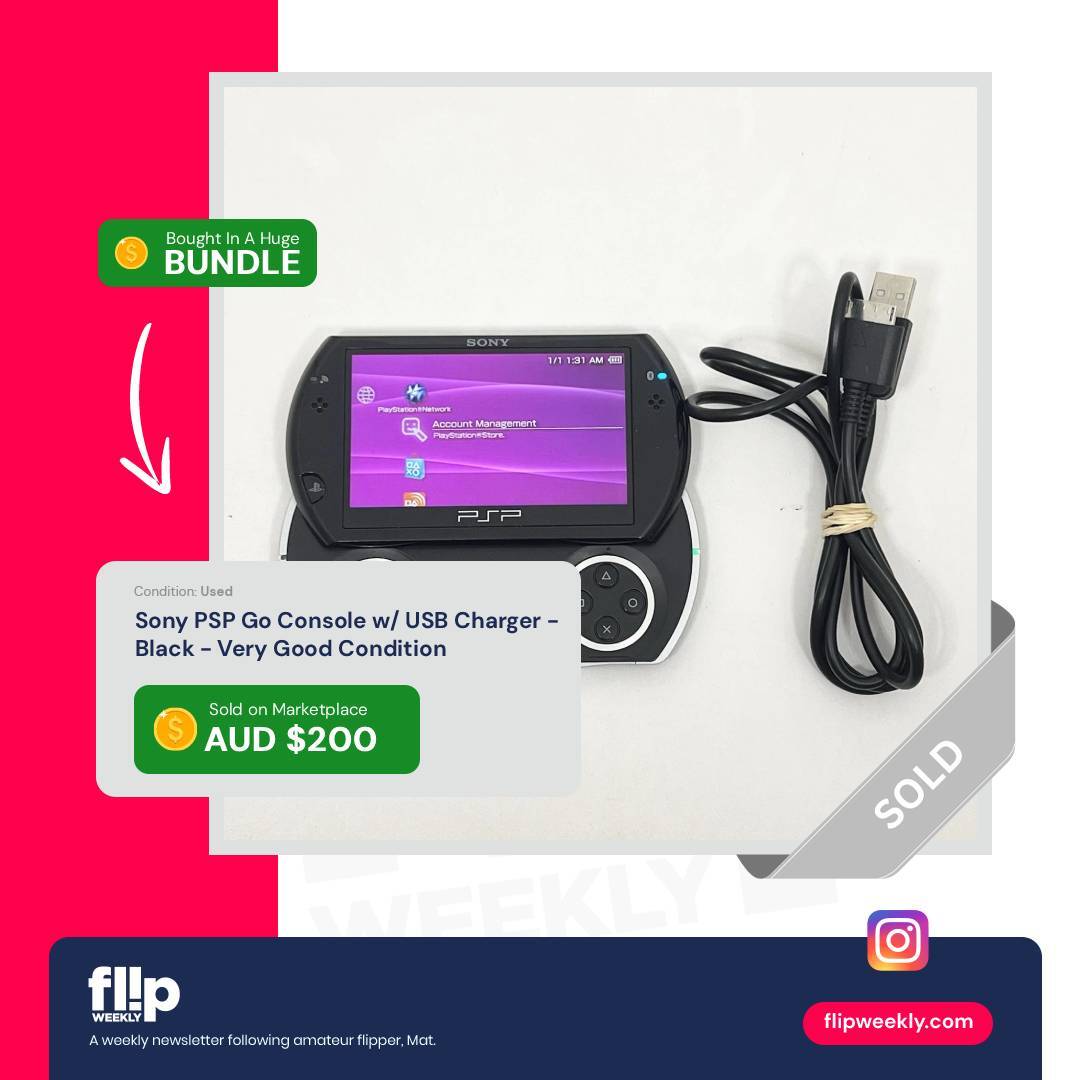 I got the PSP Go to work. I was told it wasn’t working. Turns out it just needed a charge. I bought the USB charger on eBay, waited a few days for it to arrive and then gave it a solid few hours to power back up. All of the buttons worked, the software seemed fine, literally no issues with it. I listed it up on eBay for $250 and Marketplace for $200 and a dude rocked up next day with $200 cash. That was really easy, like taking video games from a baby.