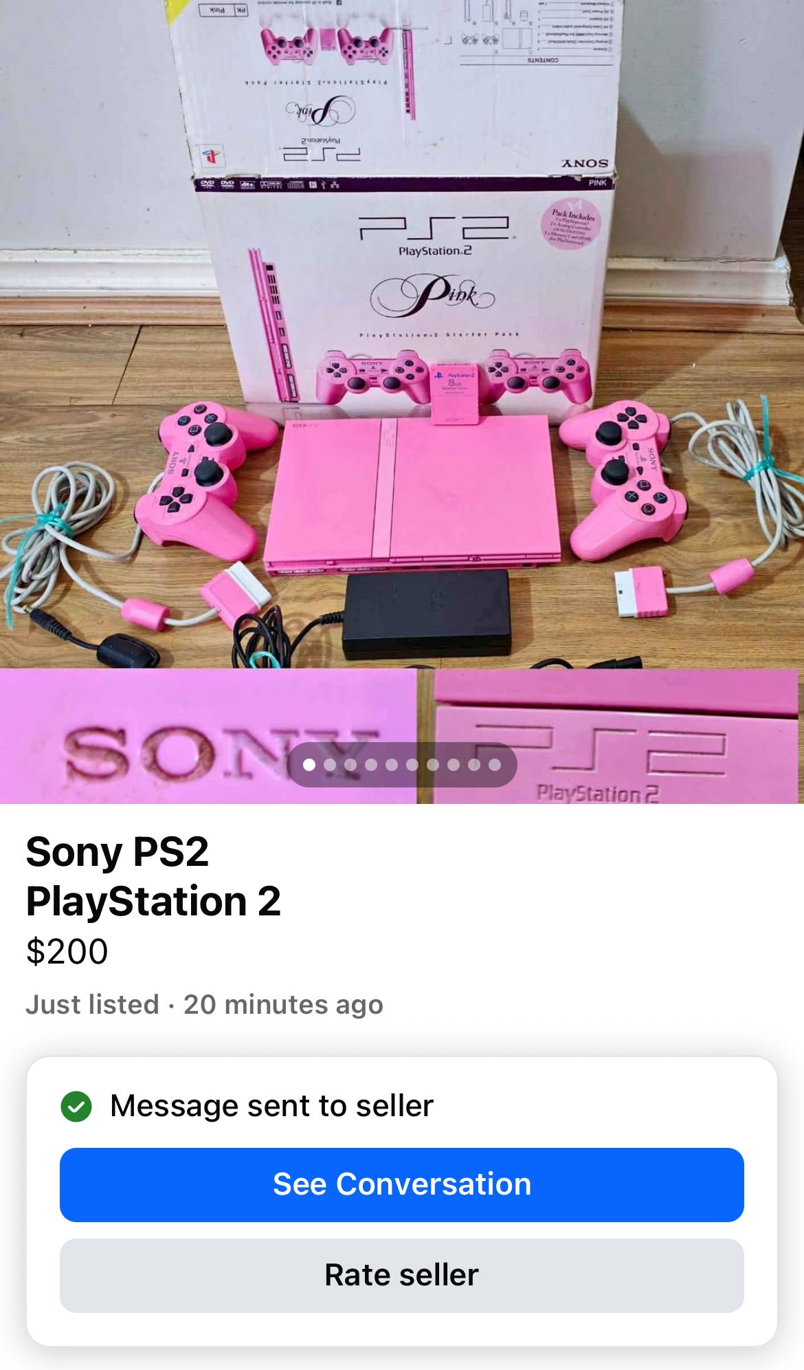 Both deals were close to each other and best of all close to me. Dispute spending a hot minute looking up to see if the pink PS2 was worth more than $200 I was able to secure it. The reason I took a bit longer to send the message was because everything in the listing screamed reseller. The seller had taken time to test everything out, the 10 photos that were uploaded included multiple collages and their rating on Marketplace was sitting at 324, almost triple my own. Even when she sent through the meetup location it was a picture of the library with graphics and text over the top - she obviously did this regularly.