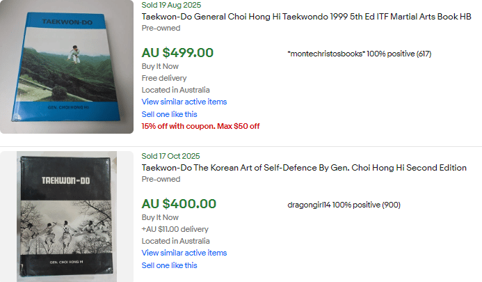 There is a huge market for this guys work and I’m a bit bummed out that the books I found were just Volume 2 and 3 of a 15 series encyclopedia. If I found all 15 they would sell for thousands. They will list up for about $100 but the ones you’re ideally wanting are the single, thick books that contain everything there is to know about Taekwondo.