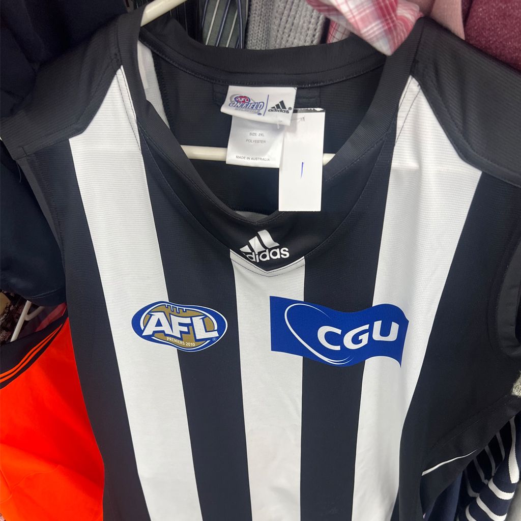 This is an AFL Collingwood Magpies jersey. When I’m looking at jerseys, I’m looking for anything that indicates that it’s a bit different than a regular jersey or it has the GPS pouch. This had both. When I looked closer at the AFL logo on the front right breast area we had a special AFL logo that had a gold filler and the text “AFL Premiers 2010“.