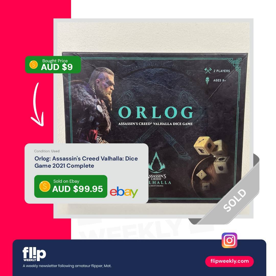 It’s a board game called Orlog, an Assassins’s Creed dice game. Assassin’s Creed is a hugely popular video game and it caught my eye in the same way video games would catch your eye in an op shop. Priced at $9, it had very few copies available on eBay Australia (just 1 at the time of publishing) yet multiple sold giving it a high sell through rate. It’s out the door in around 60 days and a profit of approximately $60.
