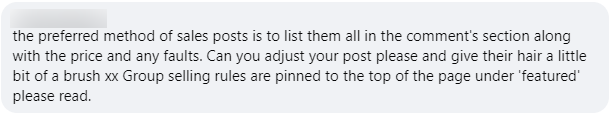 Last thing real quick. There’s nothing I hate more than an online moderator that’s drunk on their own perceived power. If you’ve contributed to Reddit you know what I’m talking about. Same goes for Facebook. I put these Bratz dolls up within a Facebook Group with the titles and prices written on the images. Look at the moderators comment on my post: