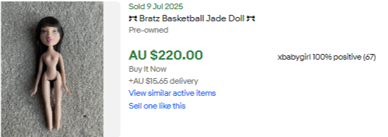 This is the exact same doll that I have, but this one is missing the original clothes and STILL sold for $220 + shipping. I love that cheeky postage cost. Someone is spending over $200 on your doll yet you’re still charging postage. Well done.